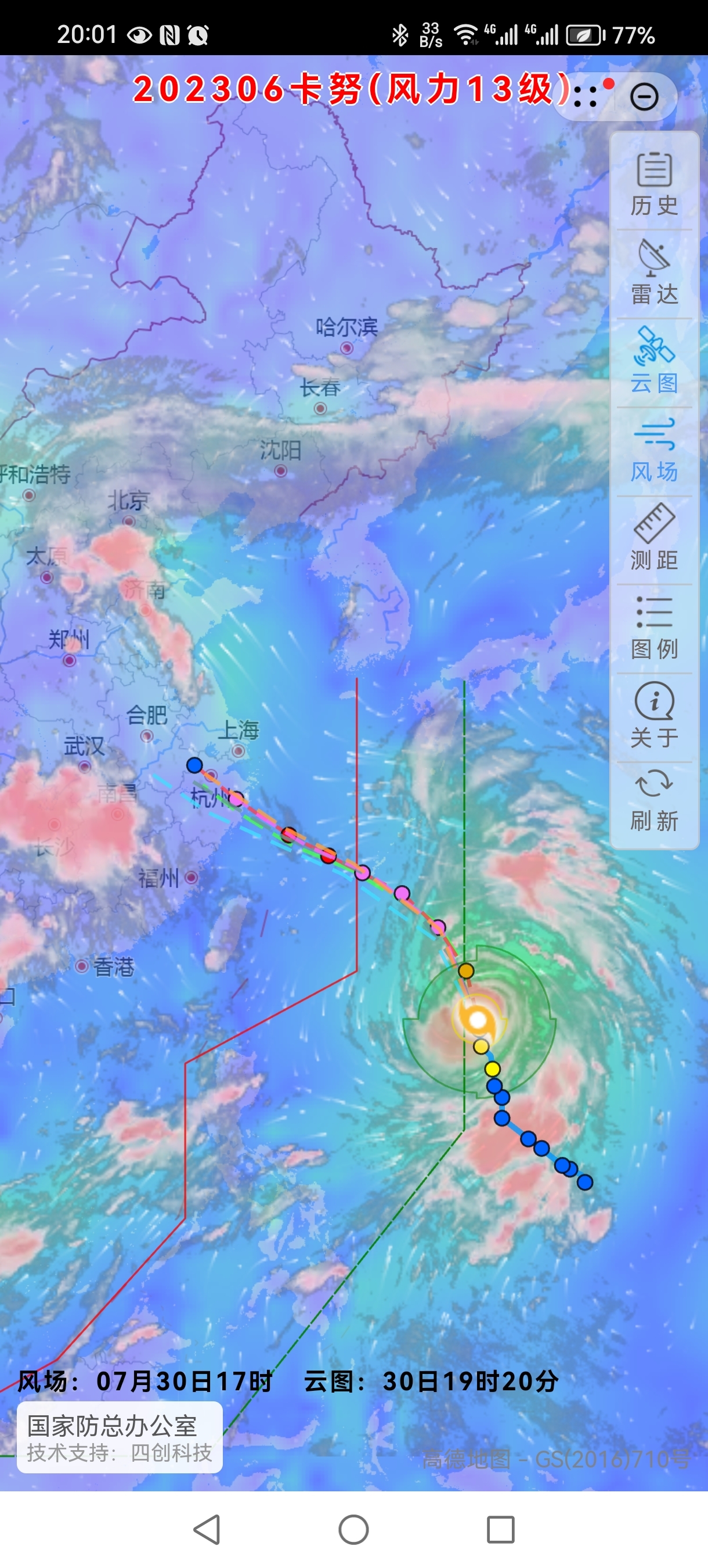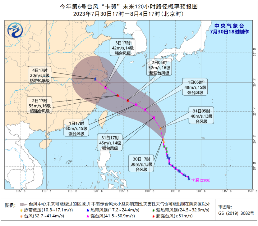 后天(8月1日)早晨至上午,“卡努”将移入东海,并逐渐向浙江沿海靠近,届时近岸海域将有4.0-5.0米的巨浪,近海海域将有8.0-10.0米的狂浪到狂涛,海浪预警级将到达橙色。