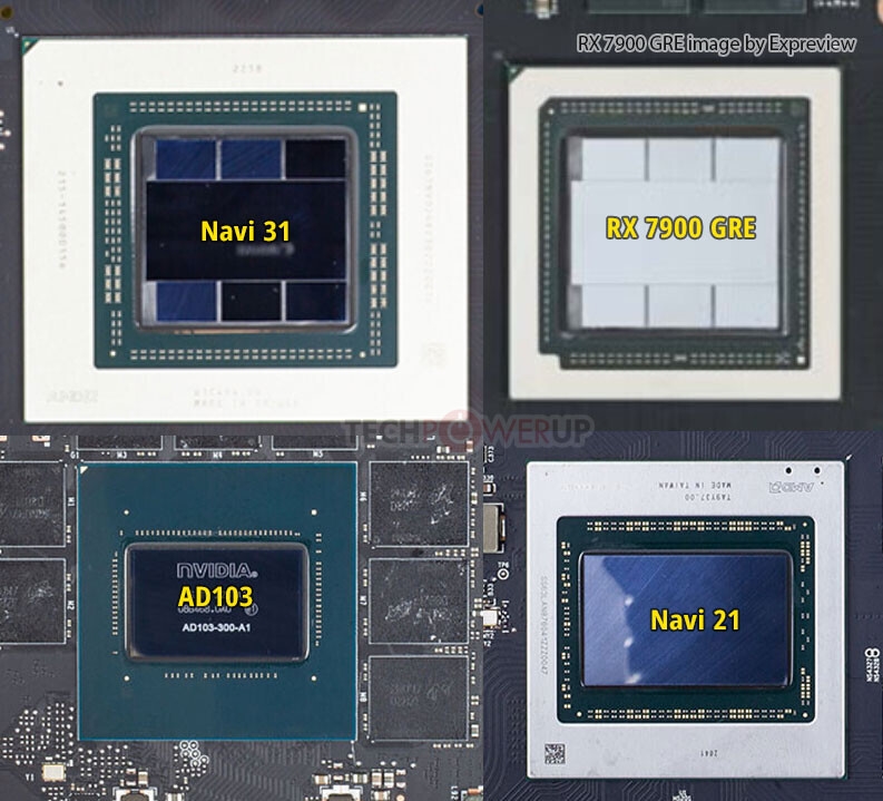 首先很直观的是,RX 7900 GRE上的Navi 31核心封装小了很多,外侧金属边缘变得很窄,整体布局更紧凑,面积上更接近AD103、Navi 21。