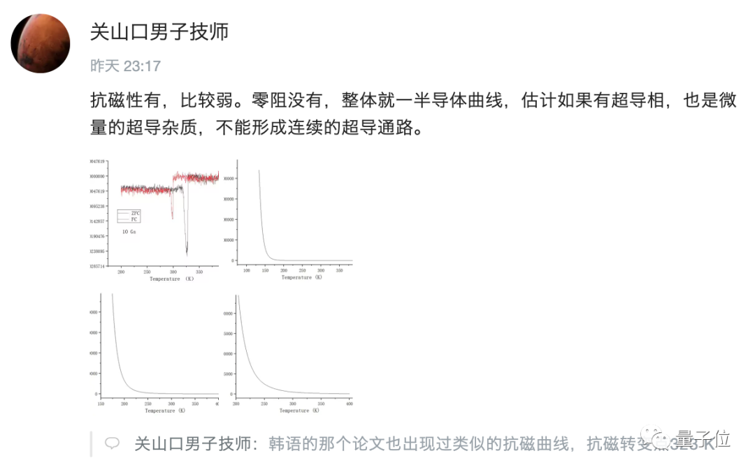 他分享的实验数据中,有一个比较值得关注的点是,能显著看到材料磁性从0到负的一个跳变,这是普通金属抗磁性所不具有的。