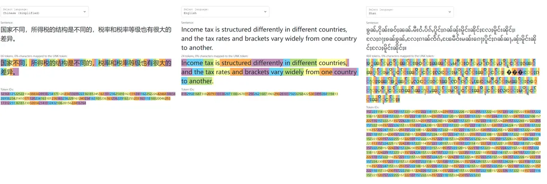 举例来看,基于OpenAI公司的GPT2模型,对于“国家不同,所得税的结构是不同的,税率和税率等级也有很大的差异”这句话的处理来看,在简体中文处理中运用到了66个Token,在英语处理中仅用到了24个Token,而在禅语处理中使用到了468个Token。