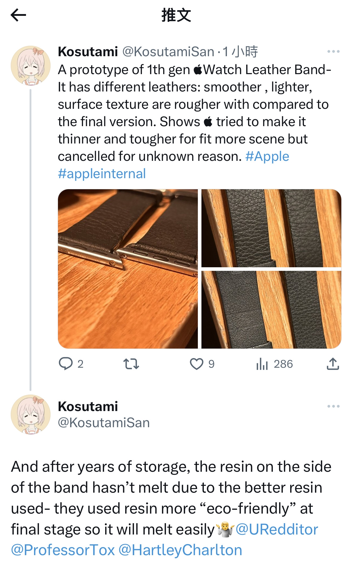 对于这一差异,Kosutami表示,是因为苹果将这款皮革表带定位为轻奢产品,不需要更强的耐用度,并且可以降低生产成本。