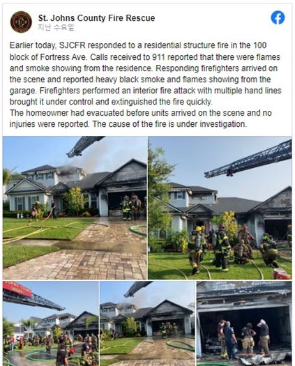 通过估算,车辆的起火引发了车库和房子的火灾,对其造成了严重的财产损失。被烧毁的物品总价已经超过 100 万美元,但好在并未造成人员伤亡。