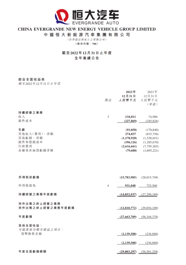 7月26日晚,恒大汽车发布了2021年及2022年业绩公告。截至2022年12月31日止年度,本集团产生亏损276.64亿元(2021年:563.44亿元)。