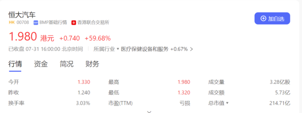 在停牌长达16个月时间之后,复牌后的恒大汽车股价坐上了超级过山车。在复牌首日收跌61.25%之后,其股价第二个交易日也就是今日迎来暴涨。截止收盘,恒大汽车股价暴涨59.68%来到了1.98港元,总市值为214.71亿港元。