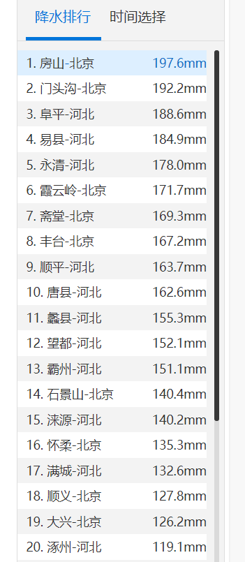 其中霞云岭达到395.2毫米,河北紫荆关为375毫米,河北顺平318.2毫米,河北徐水309.7毫米。
