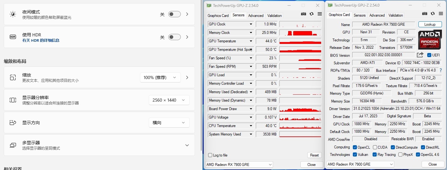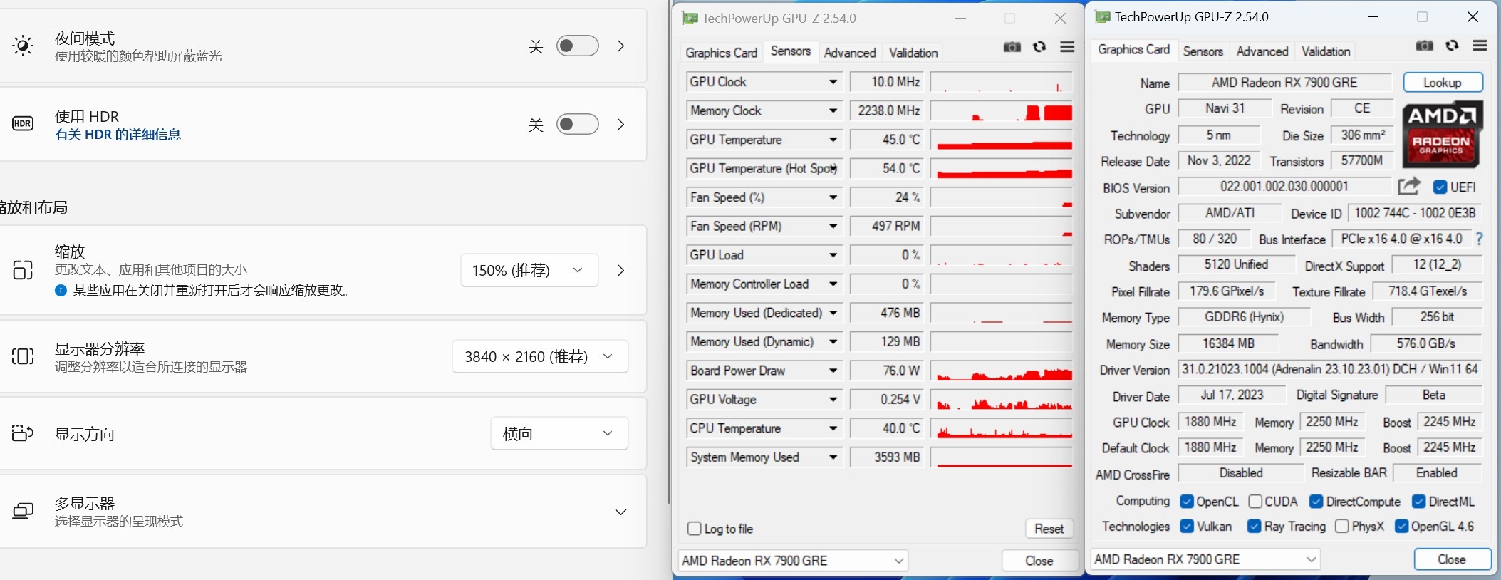 快科技在测试RX 7900 GRE的时候也遇到过类似问题,4K桌面分辨率下待机功耗会超过75W,显存也无法降频超过2200MHz,换成2K分辨率就正常了,功耗不足10W,显存频率仅为25MHz。