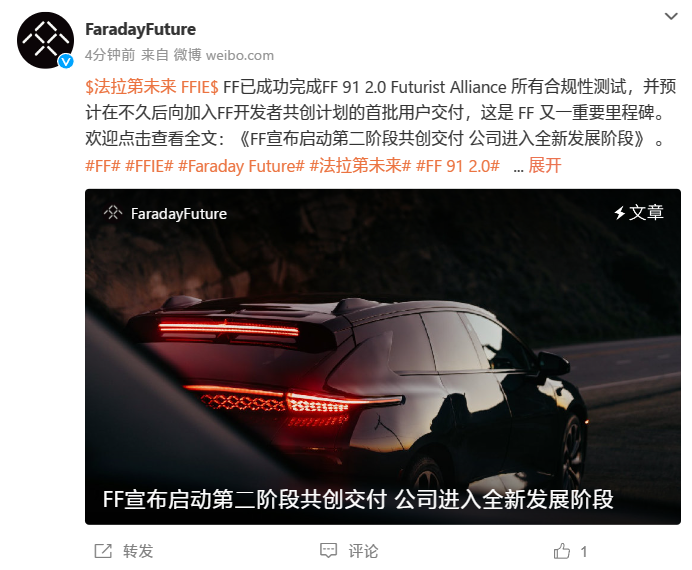 此外,近段时间FF还顺利完成了FF 91 2.0 Futurist Alliance的所有合规性测试。