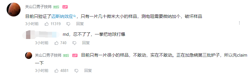 该UP主表示,目前只验证了迈斯纳效应,还未测电阻。目前合成成功的晶体非常小,实在是不敢动,正在加急烧第三批炉子。