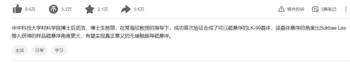 究竟是什么视频能这么火爆?该UP主在视频下方介绍称:“华中科技大学材料学院博士后武浩、博士生杨丽,在常海欣教授的指导下,成功首次验证合成了可以磁悬浮的LK-99晶体,该晶体悬浮的角度比Sukbae Lee等人获得的样品磁悬浮角度更大,有望实现真正意义的无接触超导磁悬浮。”
