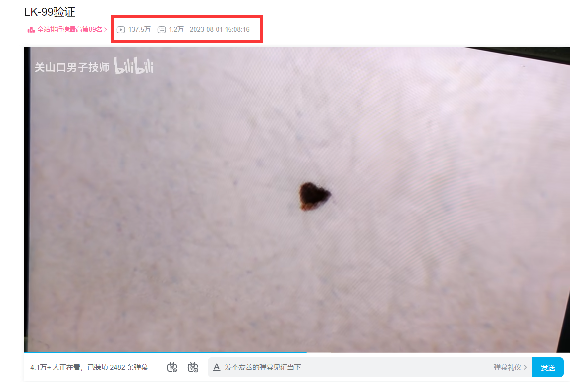 最近一段时间,韩国研究团队声称成功发现了世界上首个室温超导体“LK-99”,该材料在常压下127℃就可达到超导临界点,消息一出,很快引起热议。今日下午,B站UP主“关山口男子技师”发布的一段视频在B爆火,截稿前,视频总播放次数达137.5万,哔哩哔哩董事长陈睿也在评论区留言:“牛(3个大拇指)”。