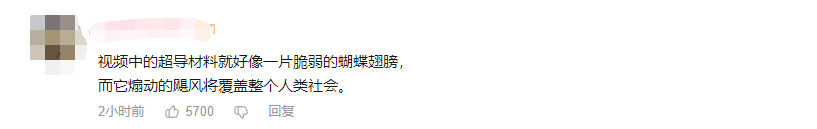 有B站网友评论称:“视频中的超导材料就好像一片脆弱的蝴蝶翅膀,而它煽动的飓风将覆盖整个人类社会。”