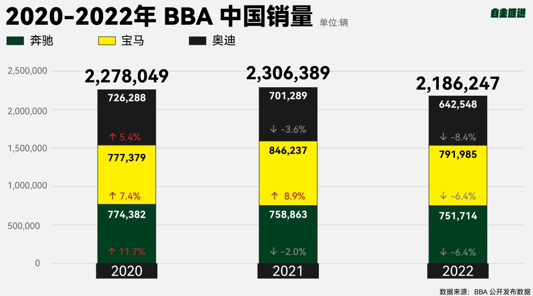 到了去年,BBA 全线崩塌,都是负增长,奔驰、宝马下降 6.4% ,奥迪下降 8.4% 。从 2020 的辉煌到 2022 的苍凉, BBA 的总量减少了 9 万辆。