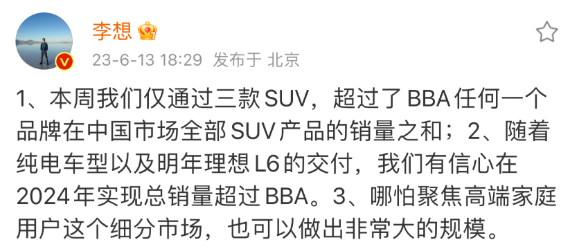 在新势力的发布会上,BBA 的地位快赶上手机发布会里的苹果了,几乎每一家车企都在说他们要干翻 BBA 。蔚来全新 ES6 刚刚亮相的时候,李斌直说,建议正考虑买奔驰 GLC 、宝马 X3 和奥迪 Q5 的人先试试 ES6 再做决定。现在的新势力销量一哥理想,还设定了相当自信的目标:2024 年总销量超过 BBA 。
