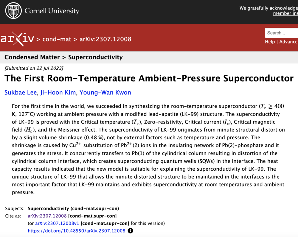 2021年,两人为LK-99在韩国申请专利,2023年3月专利申请通过后,LK-99的论文才发布在了论文档案库arXiv上,接受同行评审和实验验证。