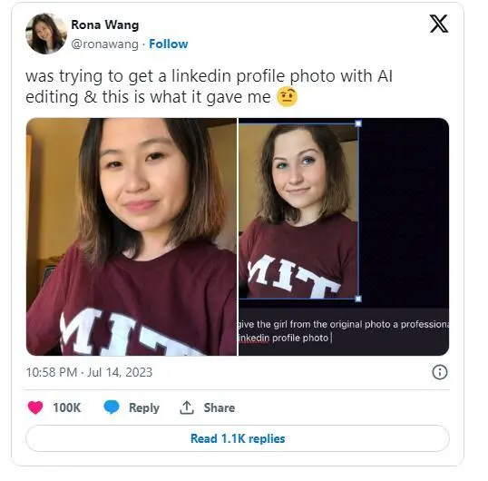 Rona Wang说:“种族偏见是人工智能工具中反复出现的问题。我从人工智能照片生成器或编辑器那里得不到任何可用的结果,所以我现在不得不放弃新的 LinkedIn 个人资料照片!” 尽管她并不是唯一一个被图像生成器变白或得到种族主义输出的人,但这起事件再次引起了人工智能造成混乱的关注,即使公司急于取代人类工人,这个软件仍然存在严重的不完善和不准确性。