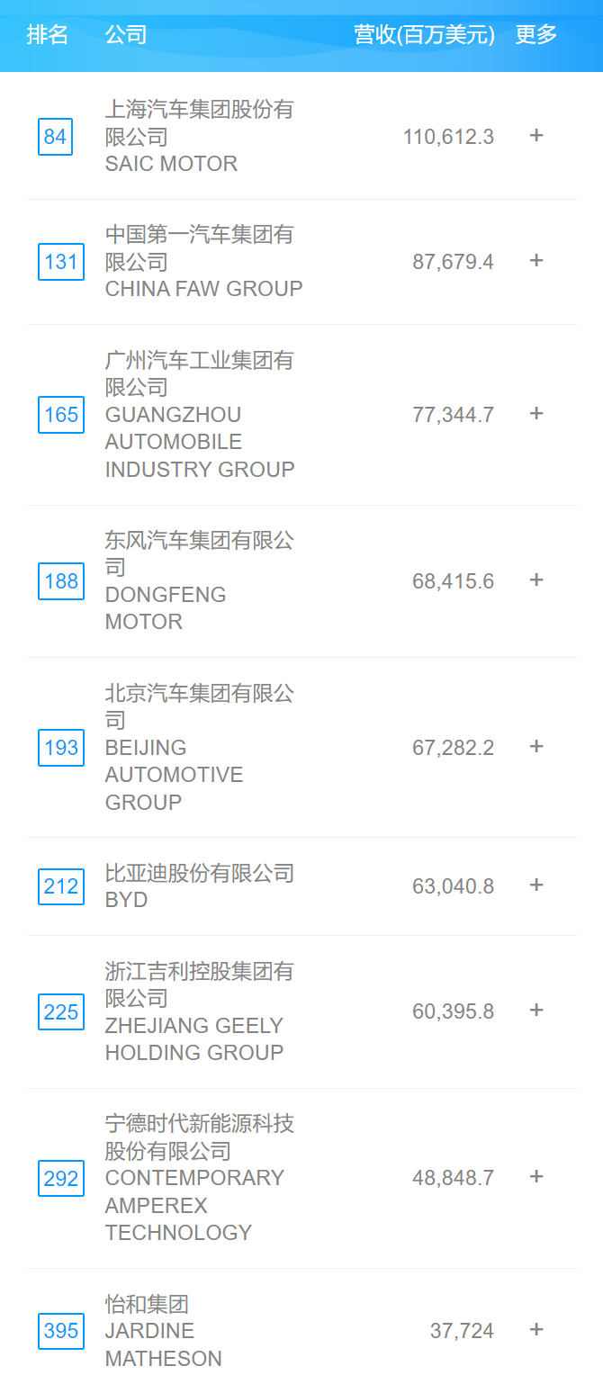 其中,上汽集团为国产车企第一,财富500强中排名84位。紧随其后的为中国一汽、广汽、东风汽车和北京汽车。