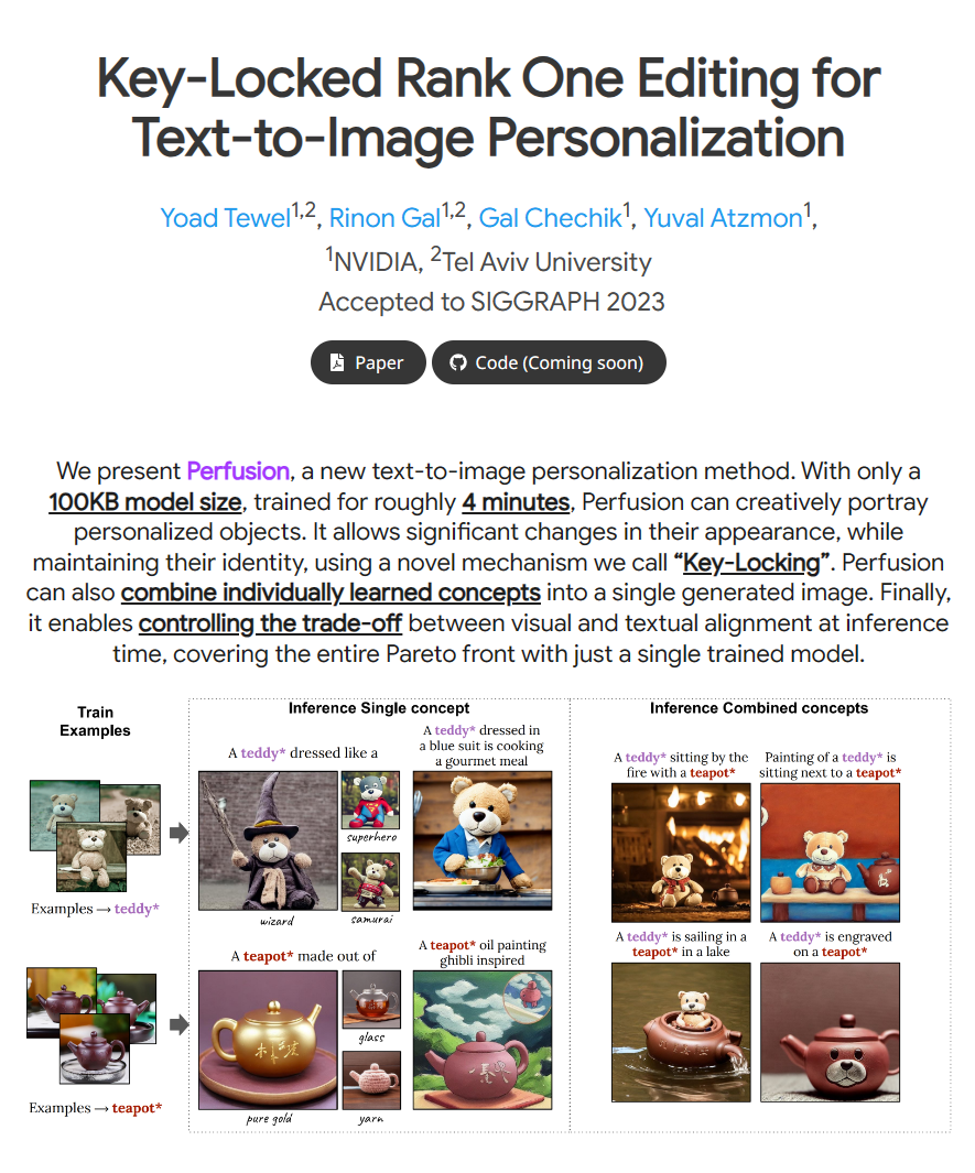 目前,NVIDIA仅在官网发布了Perfusion模型的相关论文,但官方已经承诺,将很快将该模型的代码发布。