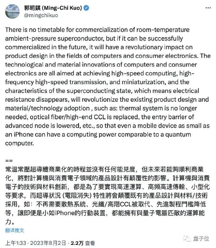 著名苹果公司分析师郭明錤发文表示“常温超导若实现,iPhone可匹敌量子计算机”。