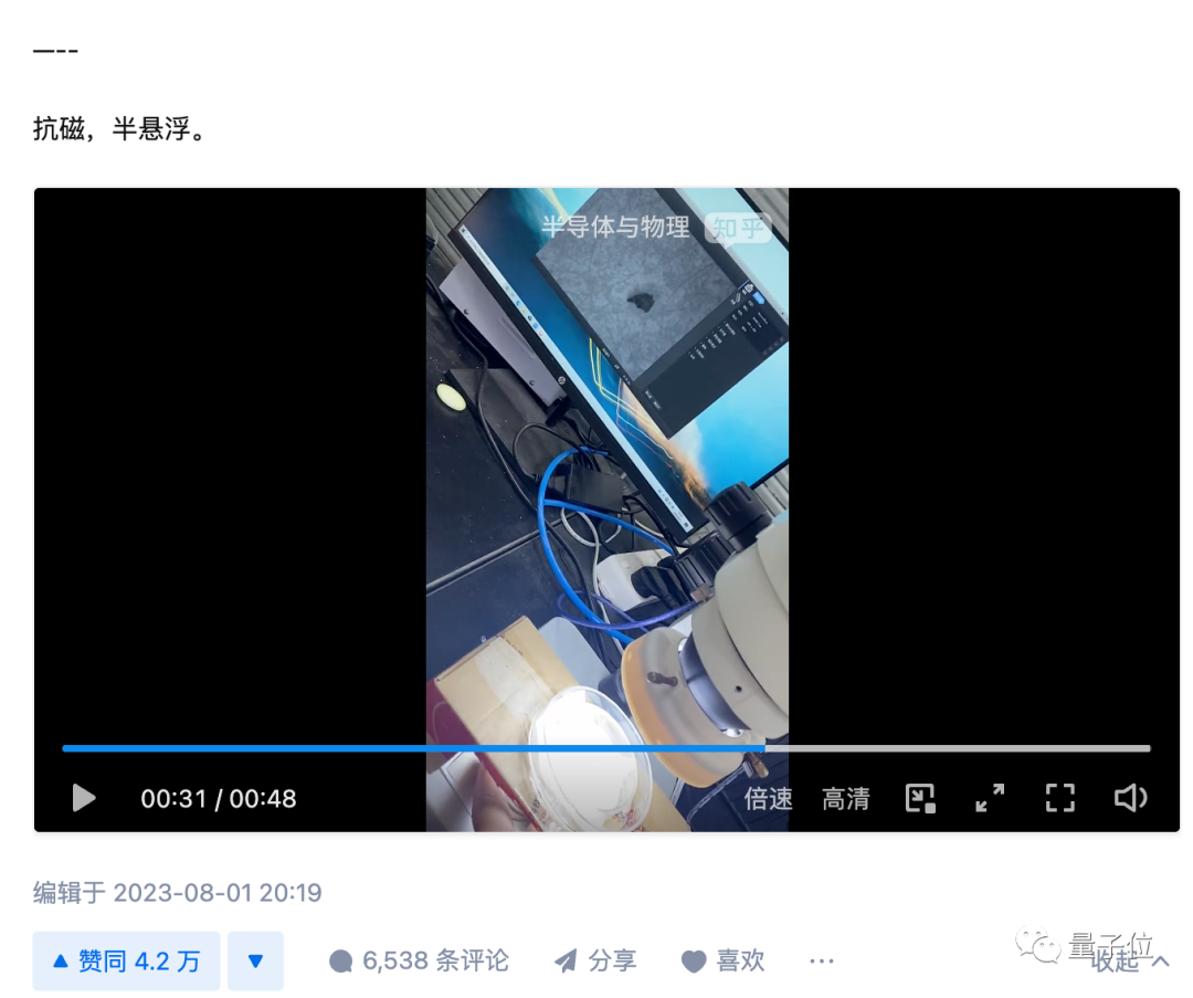 晚8点,知乎账号半导体与物理也更新了测试视频,并表示“抗磁,半悬浮”,与华中科大团队测试结果基本一致。