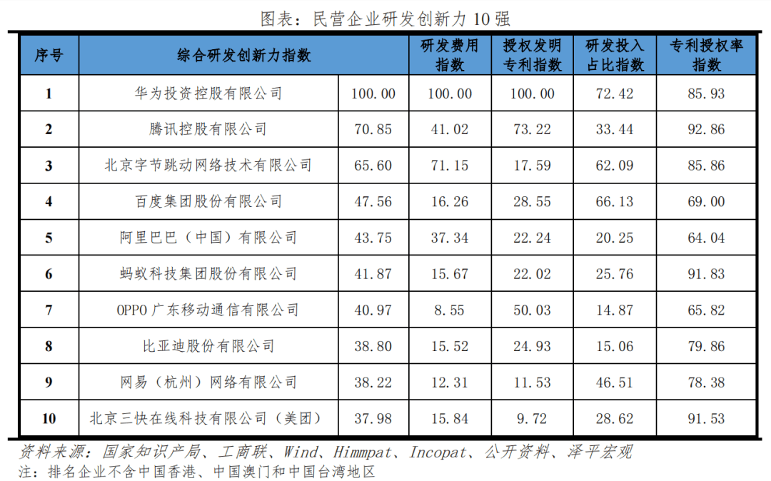 “泽平宏观”近日发布了“中国民营企业创新力十强排行榜”,这些企业主要集中在互联网平台、消费电子和先进制造行业。从排行榜来看,华为、腾讯、阿里巴巴等知名企业均在列,其中华为以研发投入和自主知识产权量以绝对优势,位列民营研发创新排行榜第一。
