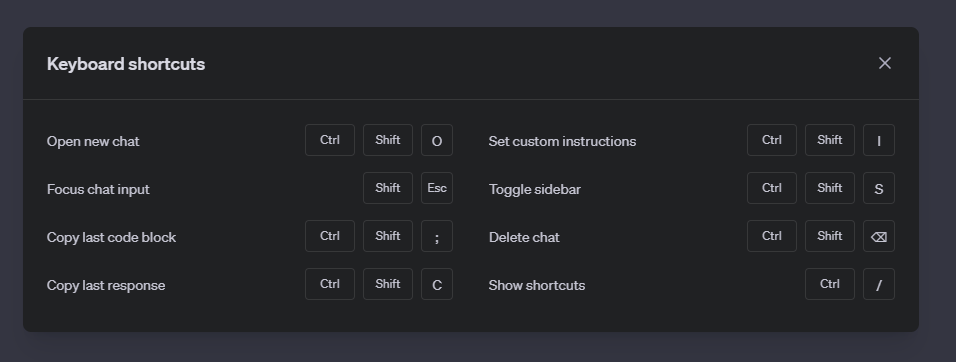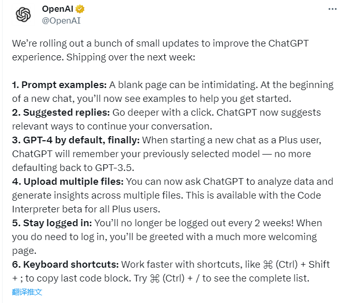 最后两项则是一些系统层面的调整。首先,现在用户不再会每隔两周就被强制登出。另外,网页版的ChatGPT现在也支持键盘快捷键。包括新建聊天(Ctrl+Shift+O)、设定个性化指令(Ctrl+Shift+I)、切换至聊天输入框(Shift+Esc)、隐藏功能栏(Ctrl+Shift+S)、复制最近的代码块(Ctrl+Shift+;)、复制最近的聊天(Ctrl+Shift+C)、删除聊天(Ctrl+Shift+Del)、展示快捷键(Ctrl+/)。