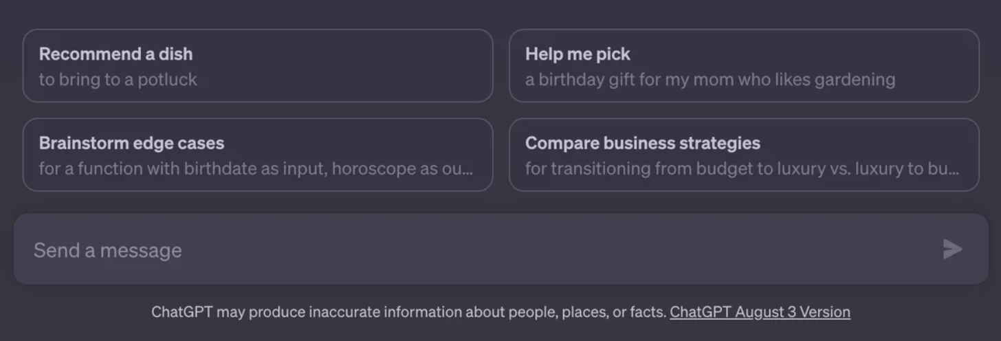 首当其冲的就是微软Bing同款的交互功能。过去,ChatGPT的网页只有一个空白的输入框,意味着用户自己要想清楚要干什么。而在这次的更新中,输入栏的上方,出现了一些可供用户点击的预设提示词,例如推荐菜单、比较商业策略等。对于尚不清楚ChatGPT能做什么的用户而言,这项调整也能起到一些新手引导的作用。