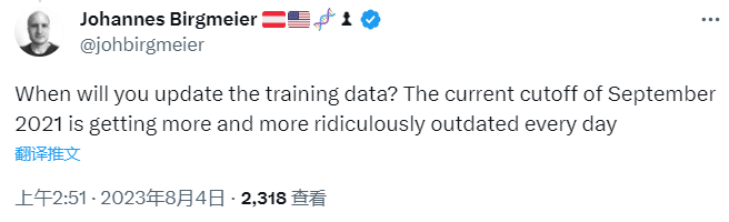 例如有网友询问,ChatGPT内置的训练数据从一开始就停留在2021年9月,这也使得机器人本身过时的程度与日俱增。需要补充的信息是,OpenAI原本在今年5月一度为ChatGPT上线内置的Bing搜索引擎,使得聊天机器人能够检索和处理互联网信息。但这项功能上线后,被曝出能够绕过某些网站的付费墙限制,OpenAI也在7月初紧急下线了这项功能。