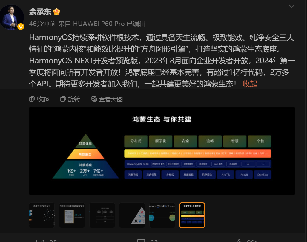 在今天下午的HDC开发者大会上,华为推出了HarmonyOS 4.0系统,并且已经开始推送,不过华为还预告了更重要的升级——HarmonyOS NEXT开发者预览版,看名字就知道是下一代鸿蒙系统了。HarmonyOS NEXT开发者预览版系统的具体技术信息没有明确,华为官微及华为常务董事、终端BG CEO、智能汽车解决方案BU CEO余承东也都表示是8月份开始面向企业开发者推送,2024年第一季度向所有开发者开放。