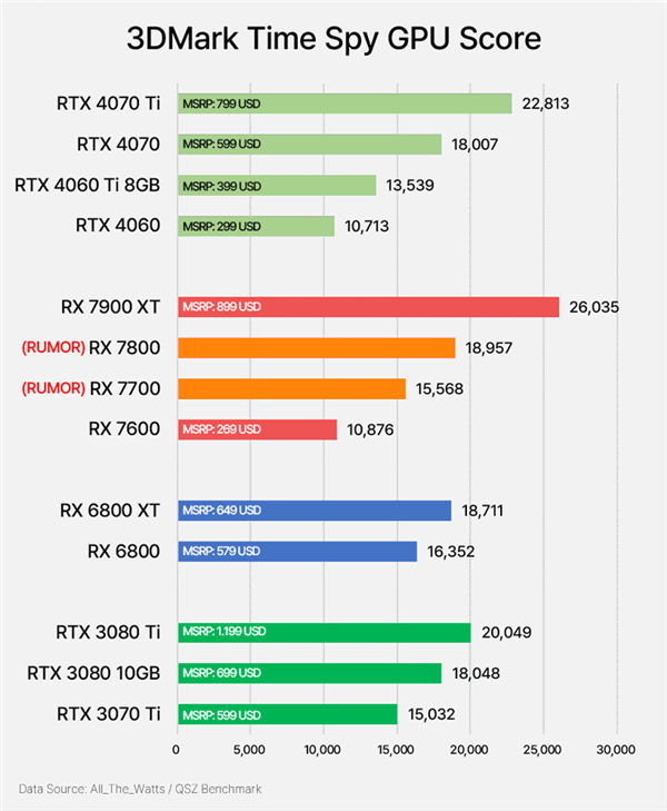 当然,RX 7800 XT显卡的最终定价还没定,之前传闻AMD很纠结,如果是499到549美元之间,国内价格在4000左右,那性价比就上来了,甚至有成为4000元档神卡的潜力。