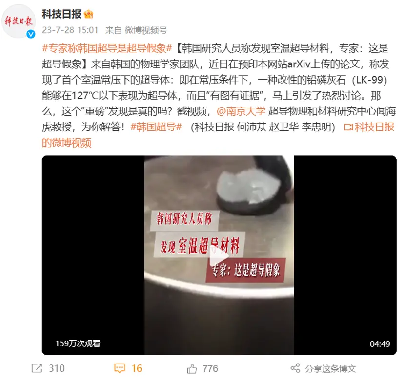 闻海虎教授在科技日报微博称韩国团队的超导是超导假象。