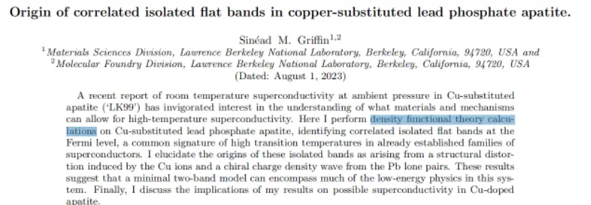最后,如果大家对计算化学理论感兴趣,我可以稍微讲一些专业的解读。此文的标题叫做《铜取代的铅磷酸盐磷灰石中相关孤立平坦能带的起源》(Origin of correlated isolated flat bands in copper-substituted lead phosphate apatite),基本内容是说作者做了密度泛函理论(density functional theory)计算,发现这种材料在费米能级具有相关的孤立平坦能带(correlated flat bands at the Fermi level),这是高温超导材料的普遍信号(common signature)。