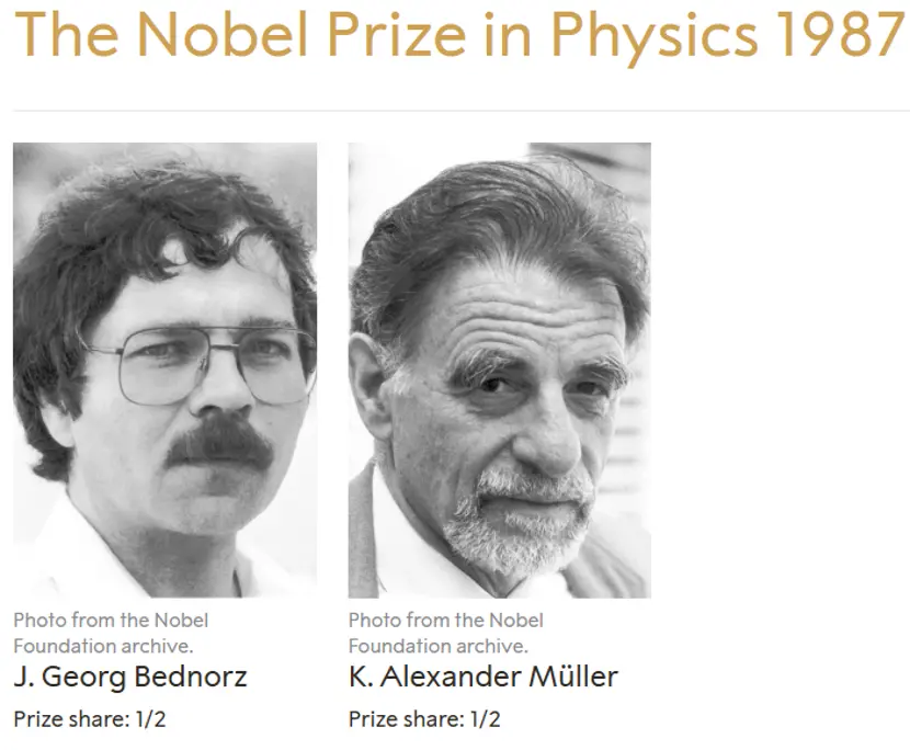1987年诺贝尔物理学奖颁给两位发现铜氧化物超导的科学家