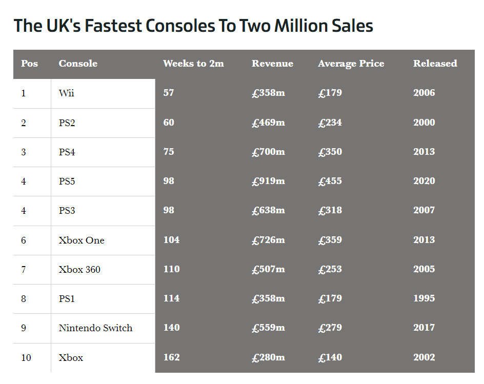 2022年10月PS5在英国销量超过了200万台,是英国第4个最快达到200万台销量的主机,但由于PS5的售价最高(455英镑》,因此在200万台销量中,PS5是创收最高的主机。