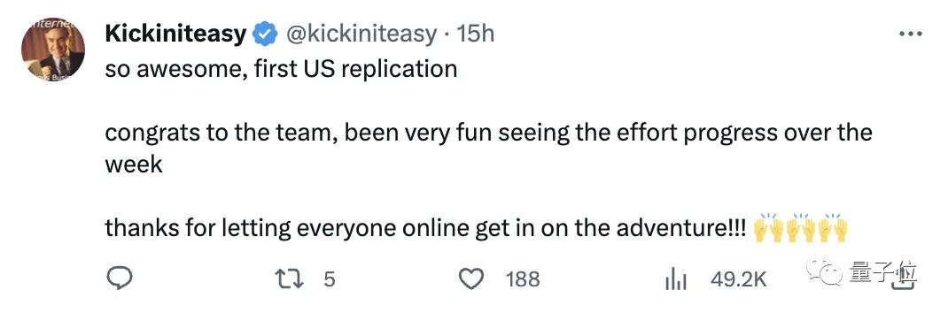 刷见证历史的网友也很多,毕竟这是他们一周左右的时间里,在线盯完的第一个美国团队复现成果。