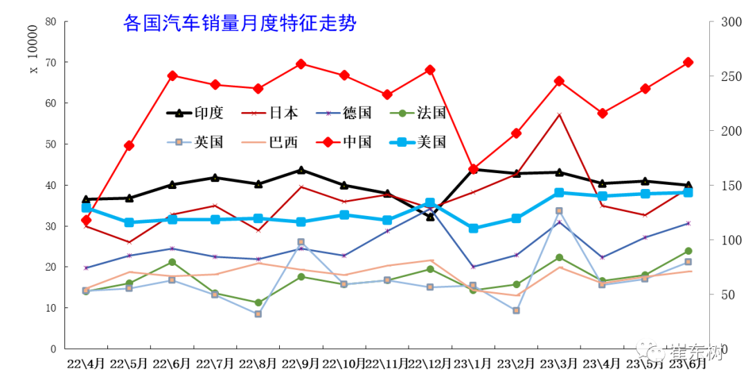 从世界各国的月度销量增速走势来看,由于中国车市仍是普及期,呈现年初年末相对较强、夏季走势相对偏软的情况;而美国车市呈现年初相对偏弱,年中相对平稳的特征,但今年的中国车市的春季拉升特征也没有出现,因此份额提升不大。