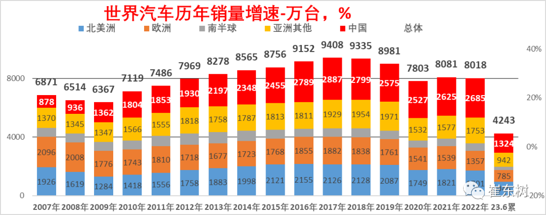 统计数据显示,2023年1-6月世界汽车销量达到4243万台,同比增长11%,但距离近几年的高点水平(2018年上半年的4766万台)差距达11%,差距水平较大。