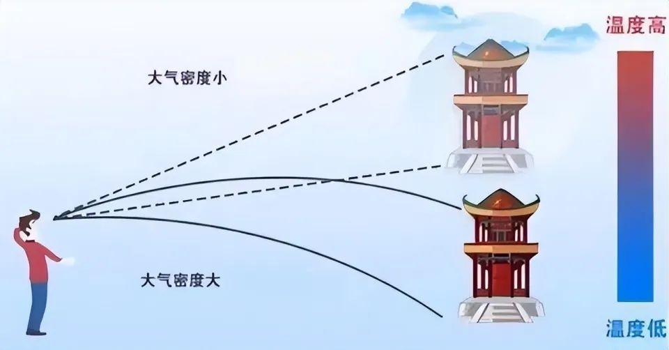 另外一种情况是,一部分光线通过不停折射发生了弯曲,最终也进入了的你的眼睛,这种情况就是我们平时看到典型的海市蜃楼的情况。