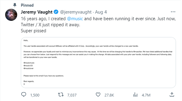 但在近日,推特官方突然通过邮件告知Jeremy Vaught,为了公司需要,账号@music将被收回。