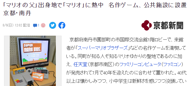 传奇级别游戏制作人马里奥之父宫本茂的老家在哪里?京都府南丹市園部町就是这位大师的家乡出生地,近日这里的公共场合之一的国际交流会馆大厅被摆放了游戏机,供来访者随意游玩,正是为了纪念宫本茂的FC与SFC游戏机。