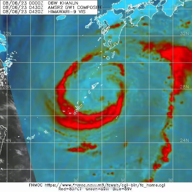今年第6号台风“卡努”(KHANUN)(强热带风暴级)的中心今天(7日)上午8点钟位于日本九州鹿儿岛偏南方大约420公里的西北太平洋洋面上,就是北纬27.8度、东经131.0度,中心附近最大风力有10级(28米/秒),中心最低气压为970百帕,七级风圈半径320公里,十级风圈半径120-160公里。