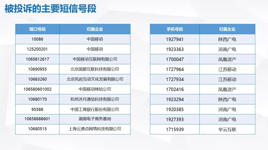被投诉的主要短信号段中,前三名都是中国移动,其中10086位居第一。