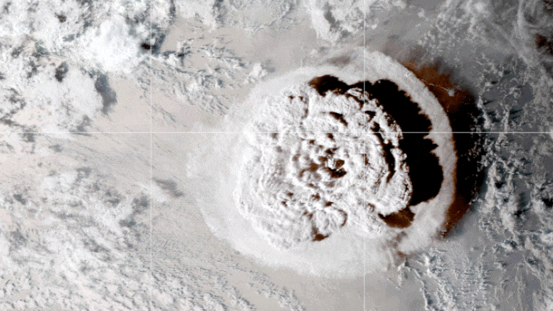 汤加火山爆发卫星图,图片来源:Wikipedia