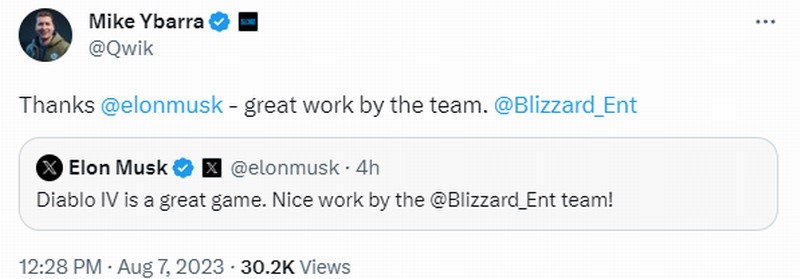 马斯克表示:“《暗黑破坏神4》是一款很棒的游戏,暴雪团队干得漂亮”。暴雪总裁Mike Ybarra回应了该推文,感谢马斯克的赞赏。