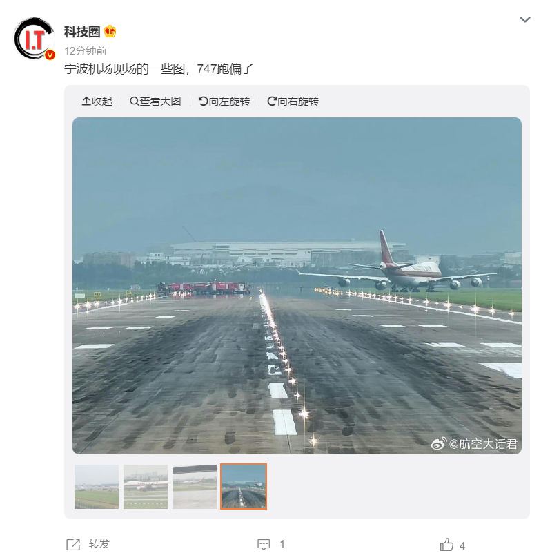 8月7日消息,网友上传照片显示,宁波栎社国际机场降落跑道草坪上,出现一辆波音747飞机,网友称飞机在降落时冲出跑道。对此,飞常准消息称,7日下午,宁波栎社国际机场发生1起外航货机着陆后滑行偏出跑道事件。1架卡利塔航空所属的波音747货机,完成着陆后进行机位滑行过程中偏出跑道。