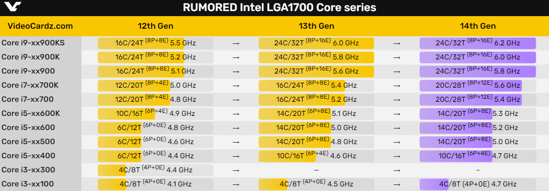 i9-14900K还是8+16 24核心,最高频率从5.8GHz来到6.0GHz。i7-14700K变化就大了,8+8 16核心变成8+12 20核心28线程,最高频率预计提升到5.6GHz。