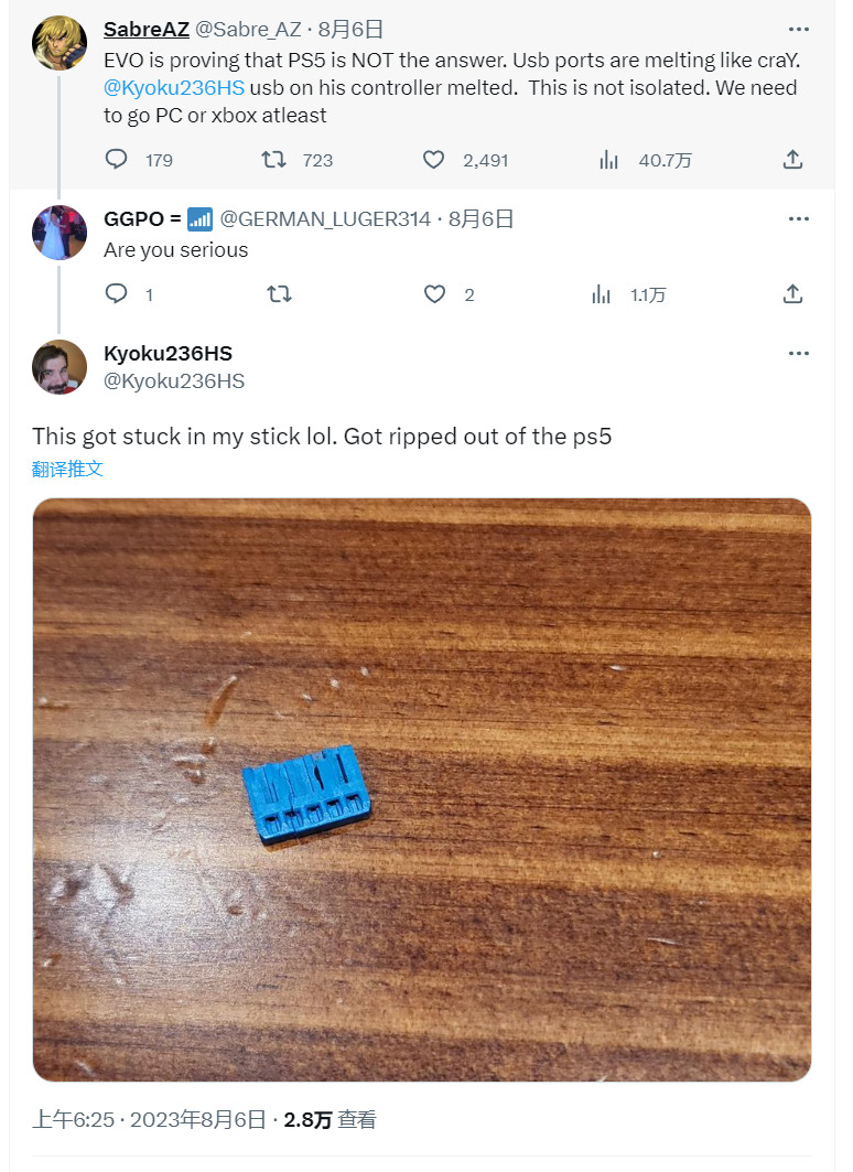 一名参赛选手Kyoku发推称,当他试图从主机上拔下街机摇杆时,几乎把摇杆弄坏了。在摇杆被拔下时,PS5主机USB端口的一个塑料片也随着摇杆一起掉出来。在这种情况下,PS5的USB端口受到了最严重的损坏。