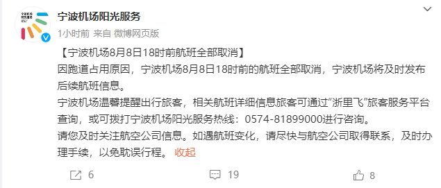在此提醒,今天有去宁波机场乘机的旅客,建议及时改签以免耽误行程,相关航班详细信息,可通过“浙里飞”旅客服务平台或可拨打宁波机场阳光服务热线咨询。
