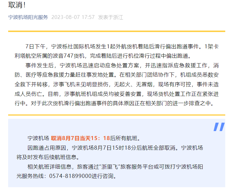 8月8日消息,今日早间,“宁波机场阳光服务”官微发文称,因跑道占用原因,宁波机场8月8日18时前的航班全部取消,后续航班信息将及时发布。根据宁波机场官方通报,7日下午,宁波栎社国际机场发生1起外航货机着陆后滑行偏出跑道事件,1架卡利塔航空所属的波音747货机,完成着陆后进行机位滑行过程中偏出跑道。
