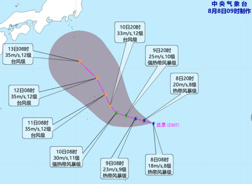 从预测路径来看,“兰恩”将会直冲日本,如果强度依然不减弱的话,将会向着“卡努”的方向会和,或许会影响我国东北地区。