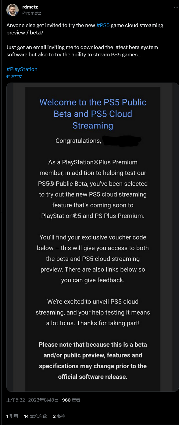 索尼此前已经预告过将开启 PS5 云游戏的 Beta 测试。目前受到邀请的玩家透露,索尼已经确认启动了测试,此次测试允许玩家在 PS5 上以最高 4K 分辨率流式传输云游玩游戏。